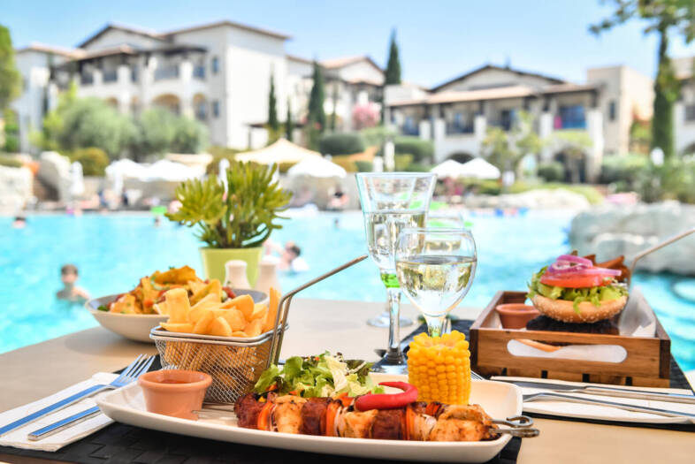 Nach dem Spiel wartet die zweite Leidenschaft: Genuss. In gleich sieben Restaurants vereint das Aphrodite Hills Hotel kulinarische Vielfalt mit gehobenem Anspruch. Von mediterraner Frische bis hin zu asiatischen Kreationen – die Küche wird in den Bewertungen als „erstklassig und überraschend abwechslungsreich“ gelobt. Besonders beliebt ist das Buffetrestaurant „Eleonas“, dessen Auswahl und Qualität immer wieder hervorgehoben werden. Wer den Abend lieber in stilvollem Ambiente verbringt, genießt im À-la-carte-Restaurant „Stone Grill“ einen spektakulären Sonnenuntergang bei exquisiten Gerichten – ein Erlebnis, das laut Gästen „dem Tag den perfekten Abschluss verleiht“.